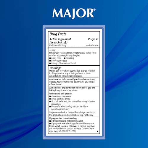 | ALLERGY RELIEF FOR CHILDREN | Major’s Children’s Cetirizine provides 24-hour allergy relief from sneezing, runny nose, itchy watery eyes, and itching of the nose or throat caused by hay fever and other upper respiratory allergies. |